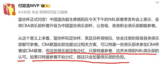 据中国篮协联合党委副书记杨阳表示,今年的CBA俱乐部杯会实现扩军,并且会将CBA俱乐部杯赛升级为“中国篮协俱乐部杯”,让各级、各类职业俱乐部都能参赛。对此媒体人付政浩也对杯赛的扩军做了一个分析,他表示,CBA此前也提出过相关方案,可以邀请一些俱乐部来参加CBA杯赛或者是CBA联赛,但俱乐部没有分红,只是特邀参赛,这并没有得到NBL俱乐部的认可,如果只是特邀而不给分红,那只会增加俱乐部的负担。