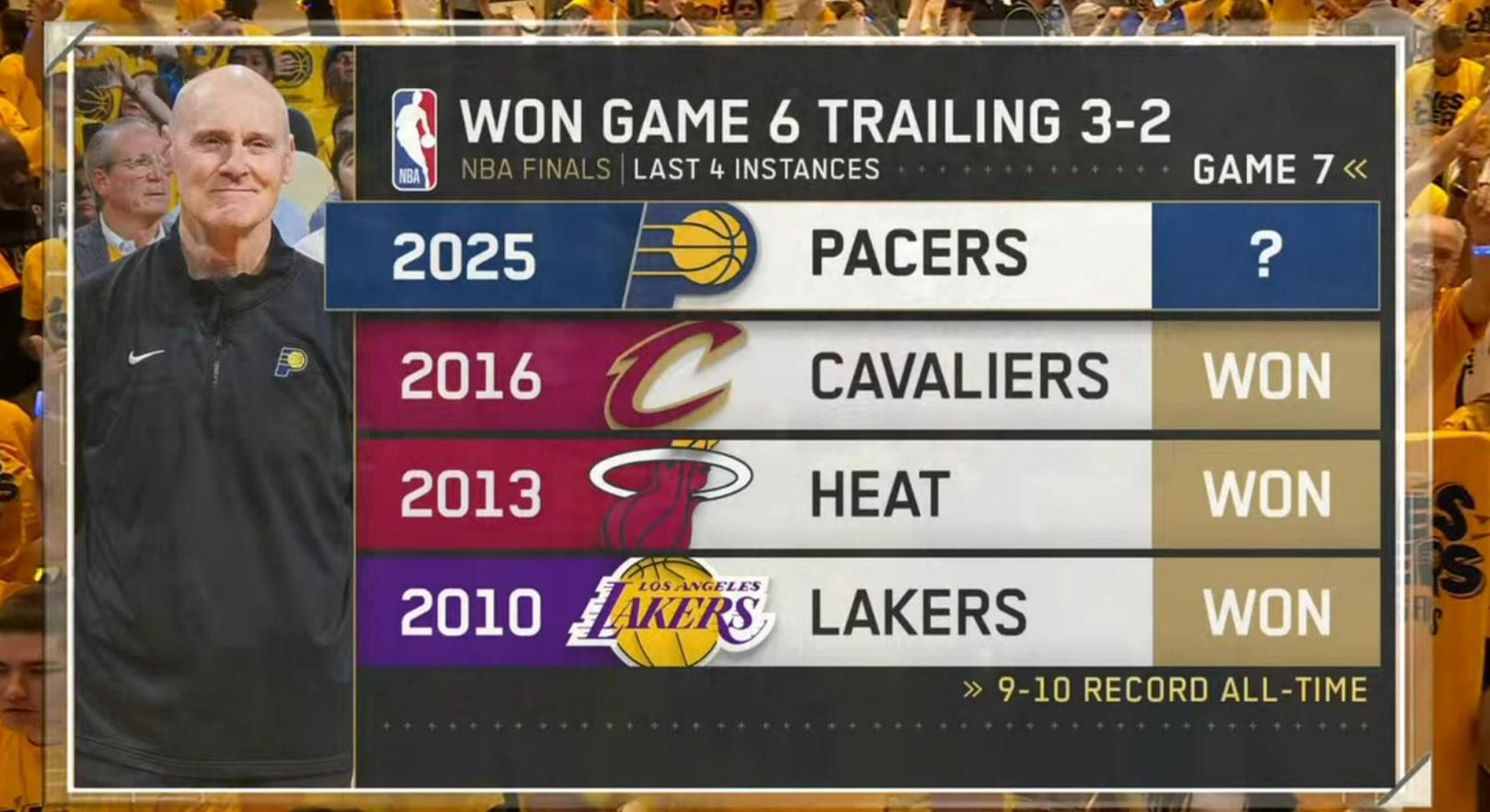 在本场比赛前,步行者以2-3落后,本场比赛是非赢不可的一战。最终他们顽强地将系列赛拖入抢七。据统计,除今年外的最近三支总决赛2-3落后的情况下并赢下G6的球队中,这三支球队全部夺冠(2010年湖人、2013年热火和2016年骑士)。但值得一提的是,前两次的总决赛赛制为2-3-2,湖人和热火在最后两场均为主场。