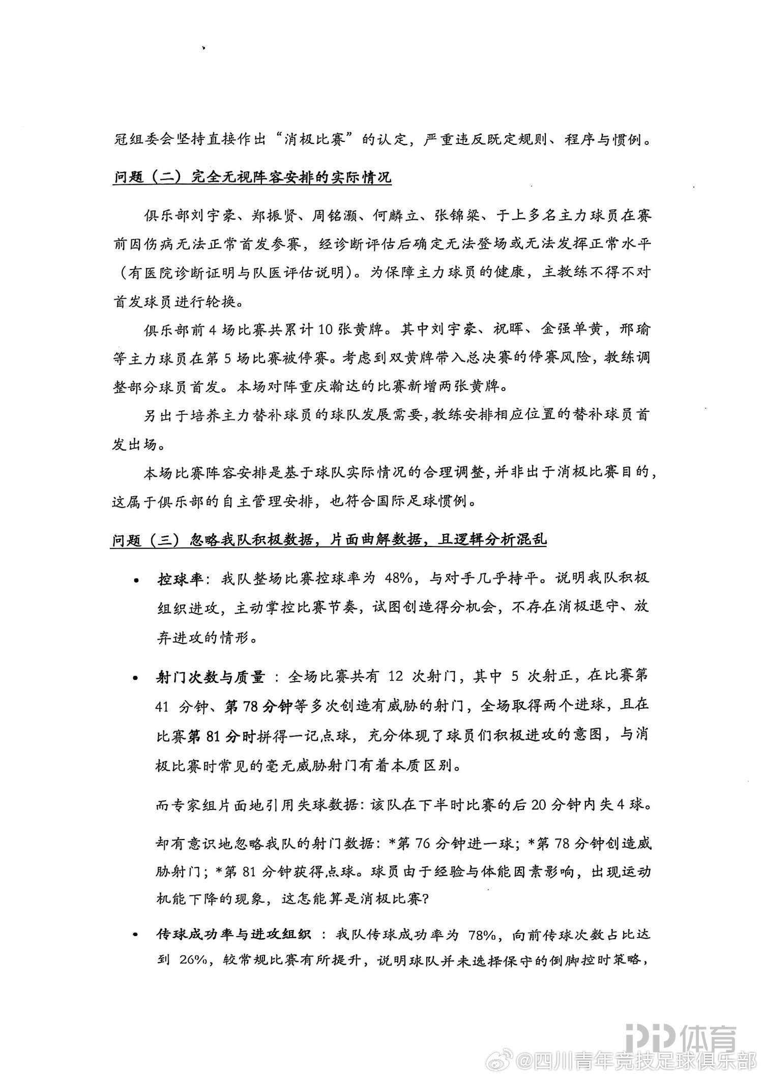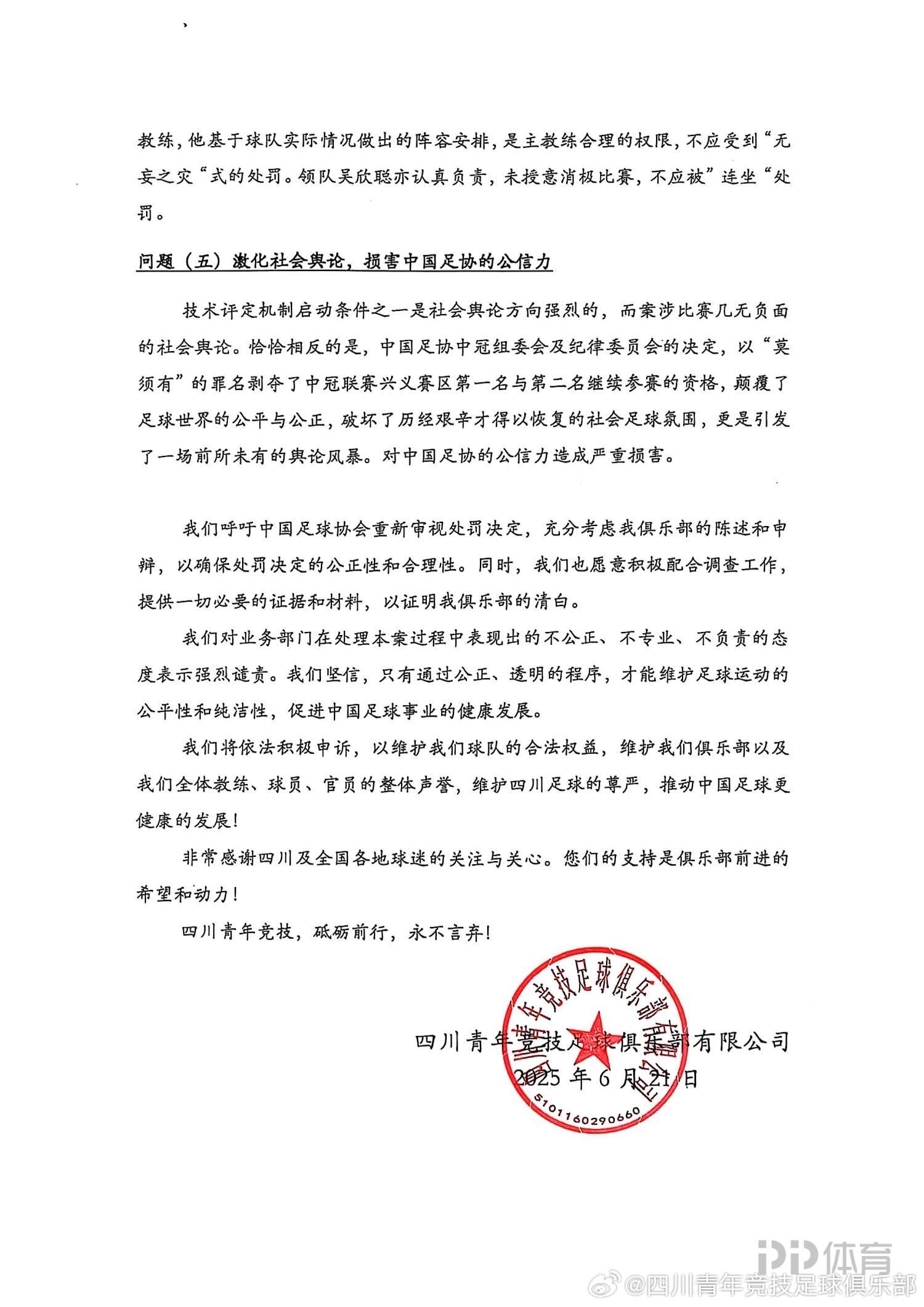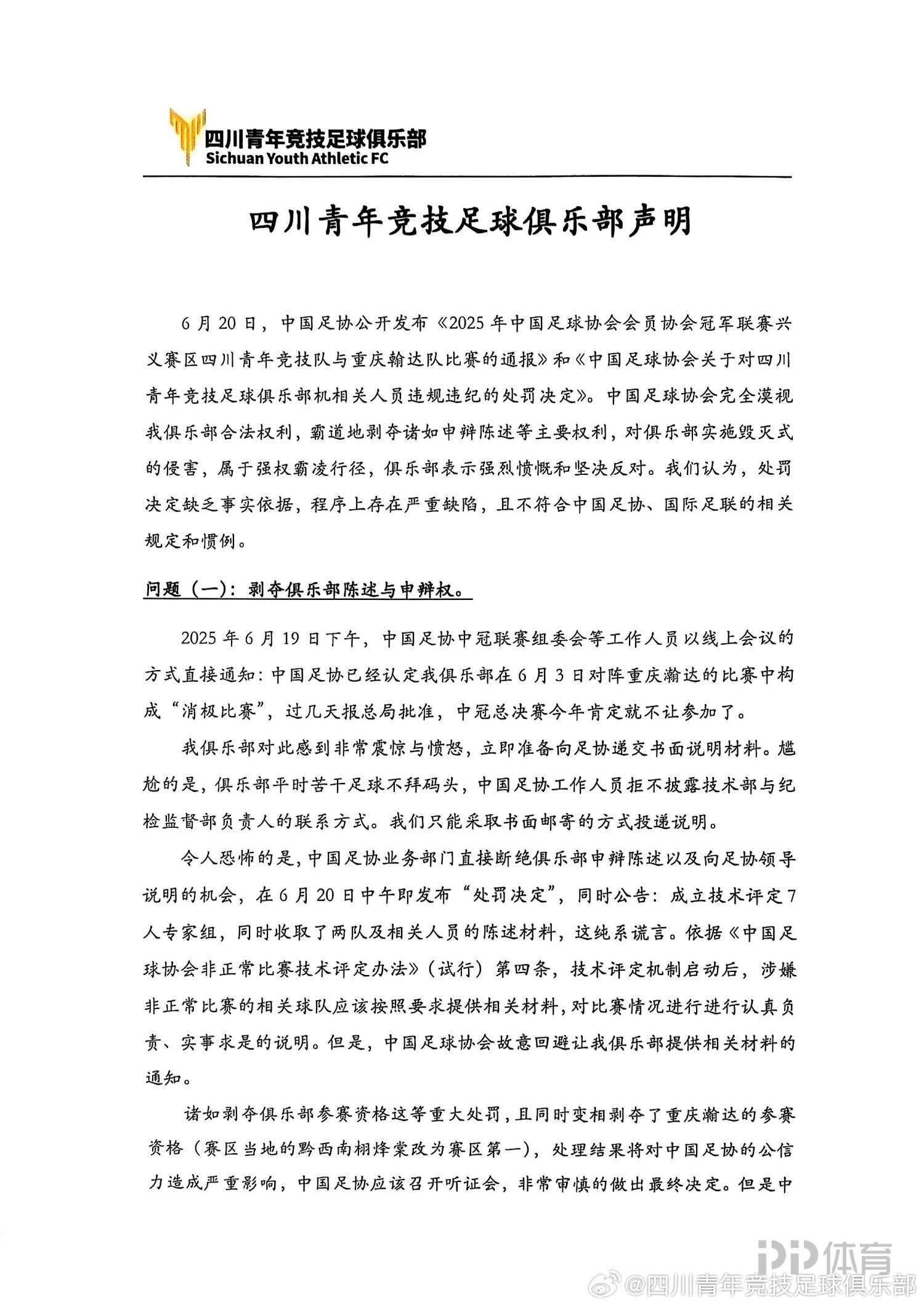 在声明中,四川青年竞技足球俱乐部表示:中国足球协会完全漠视我俱乐部合法权利,霸道地剥夺诸如申辩陈述等主要权利,对俱乐部实施毁灭式的侵害,属于强权霸凌行径,俱乐部表示强烈愤慨和坚决反对。我们认为,处罚决定缺乏事实依据,程序上存在严重缺陷,且不符合中国足协、国际足联的相关规定和惯例。