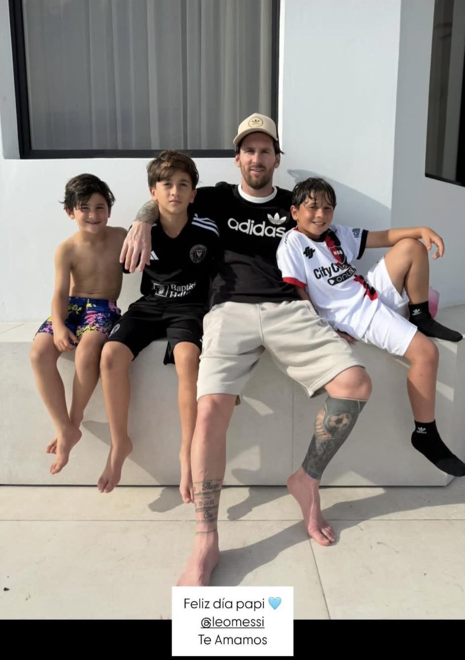 照片中,身穿休闲装的梅西被三个活泼的儿子亲密环绕,一家人笑容灿烂,画面温馨满满。